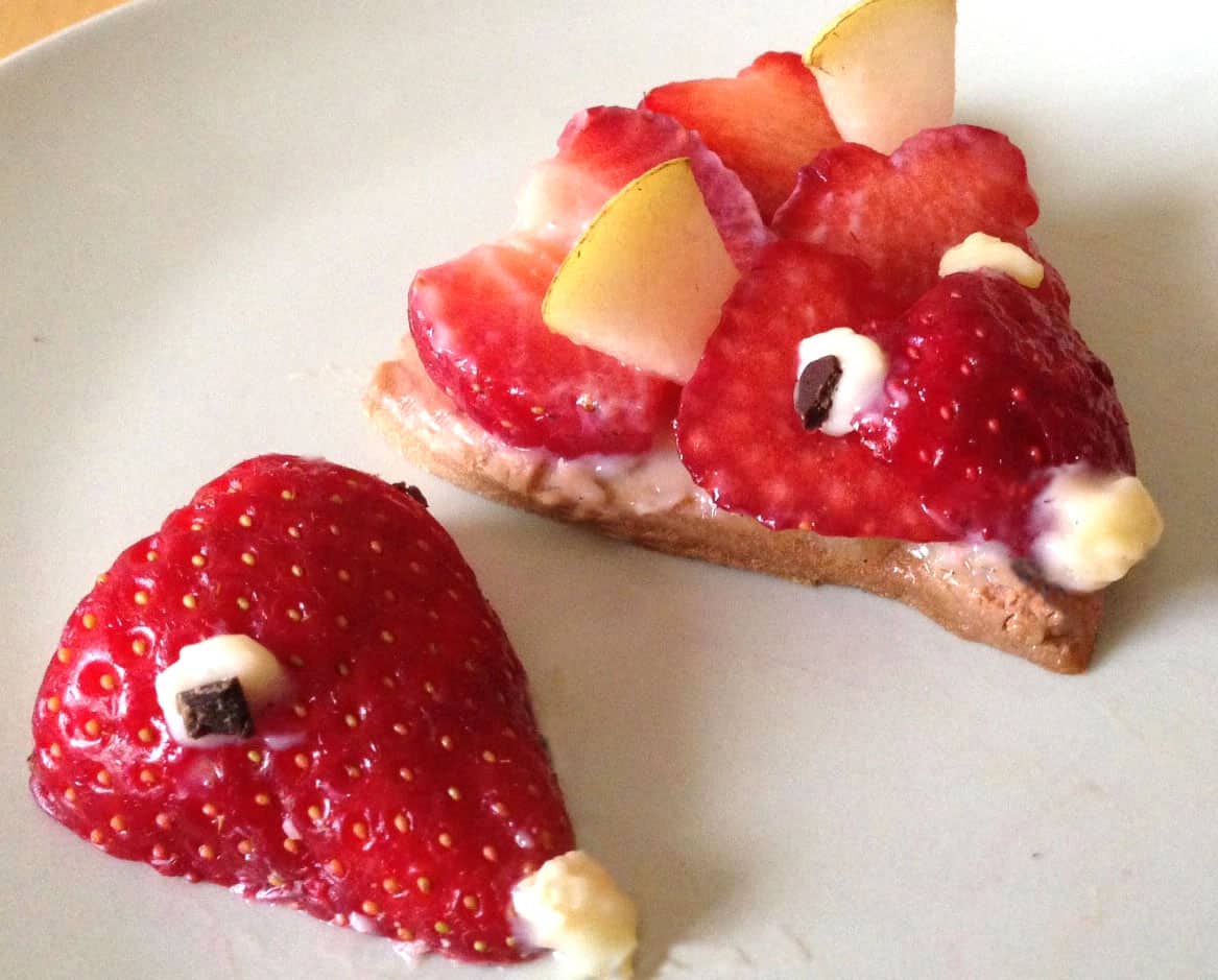 fragole topoPerché non preparare queste crostatine buffe e golosissime? Sono semplici crostatine di fragole, fatte di pasta frolla, crema pasticcera e fragole ma… a forma di topolini! Da preparare con i bambini, o per rallegrare un buffet di festa di compleanno o semplicemente per divertirsi, utilizzando avanzi di pasta frolla o di pasta brisée.