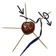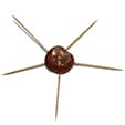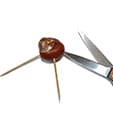 - Prendere la castagna e infilarci 5 stuzzicadenti come nell’immagine, tutti sulla stessa linea. Se la castagna è fresca, gli stuzzicadenti entreranno senza fatica. In caso contrario, usate la punta delle forbici per incidervi dei buchini nei quali inserirete gli stuzzicadenti.