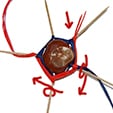 - Ripetere la stessa operazione con un filo di rafia di colore diverso, per esempio rosso, partendo dallo stuzzicadenti che precede il nodo fatto con il filo blu.