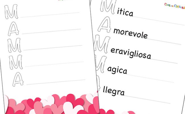 Stai cercando un’attività originale e affettuosa per la Festa della mamma? Ecco un’idea semplice, creativa e super tenera: un dolcissimo acrostico della parola MAMMA da stampare, colorare e completare con parole dolci.