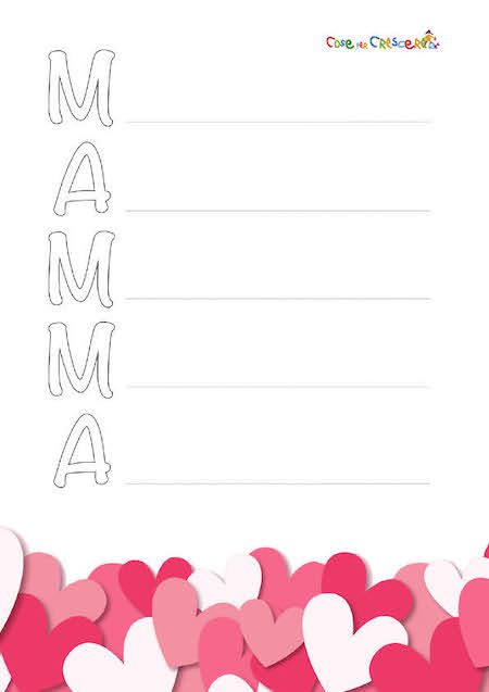 Abbiamo preparato una scheda gratuita in PDF perfetta per bambini della scuola primaria e della scuola dell’infanzia, da usare a casa o in classe. Basterà stamparla, scrivere una parola o una frase per ogni lettera e il gioco è fatto! Una letterina, un regalo unico, fatto con il cuore che può anche accompagnare un lavoretto per la Festa della mamma ❤️