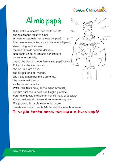 Al mio papà è una poesia per la festa del papà scritta da Maria Teresa Greco, una poesia per bambini adatta sia ai bambini della scuola primaria sia a quelli più piccoli che frequentano la scuola dell’infanzia. La proponiamo da leggere online e in una versione illustrata con un disegno per bambini da colorare e da stampare gratuitamente. Basta scorrere la pagina verso il basso e cliccare sull’immagine dove segnato: si aprirà una seconda finestra con la filastrocca per il papà in formato pdf, da scaricare e/o da stampare direttamente con una normale stampante e su un foglio in formato A4.