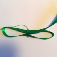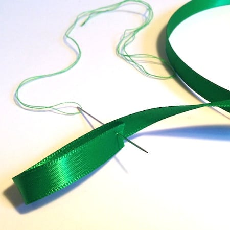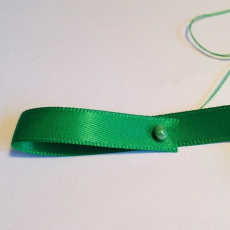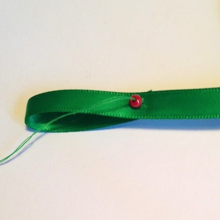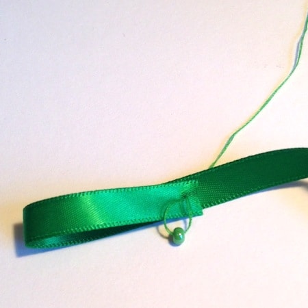 - Infilare il filo nell’ago e fare un nodo all’estremità del filo. Ripiegare una delle estremità del nastro su circa 4,5 cm e infilare ago e filo per fermarlo. Infilare una perlina verde e ripassare l’ago dall’altra parte.