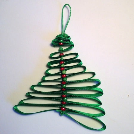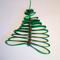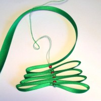 - Ripiegare il nastro nell’altro senso, cercando di mantenere la stessa misura precedente (circa 4,5 cm) rispetto al centro. Infilare una perlina verde e proseguire, diminuendo mano a mano la dimensione del nastro ripiegato e invertendo i colori delle perline.