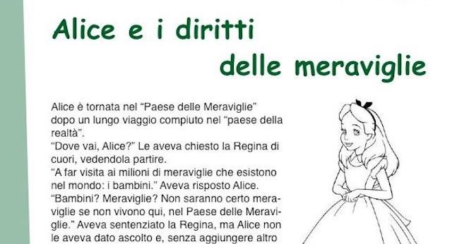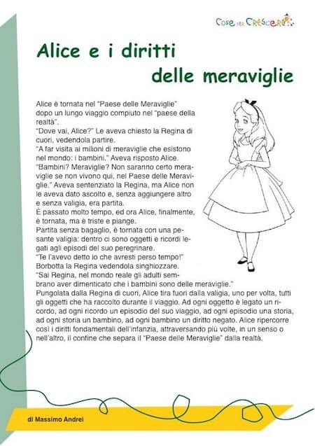 Alice e i diritti delle meraviglie è un racconto che fa parte delle “Fiabe e diritti” di Massimo Andrei, storie che regalano ai bimbi una consapevolezza dei loro diritti. Proponiamo la storia sia da leggere online che da stampare gratuitamente, illustrata con un disegno da colorare. Per stampare la storia, scorri la pagina verso il basso e clicca sull’immagine dove segnato: si aprirà una seconda finestra, con la storia sui diritti dei bambini in formato pdf, pronta per essere scaricata e/o direttamente stampata.