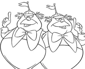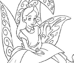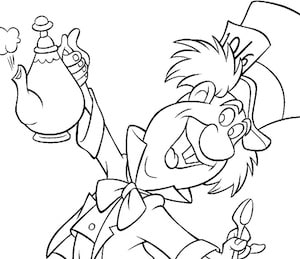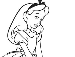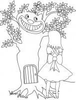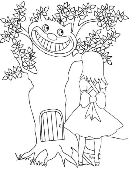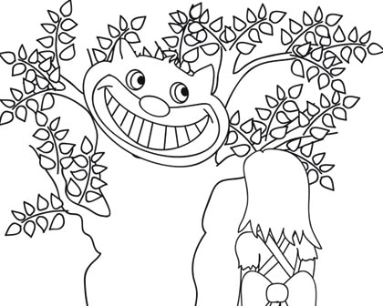 Disegno di Alice nel Paese delle Meraviglie che incontra lo Stregatto, la più strana e imprevedibile creatura del Mondo delle Meraviglie: può muovere il corpo in qualsiasi modo, comparire e scomparire in qualsiasi luogo e in qualsiasi momento… Perennemente sorridente, parla solo per enigmi.