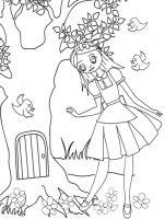 Disegno di Alice nel Paese delle Meraviglie che insegue il coniglio bianco. Il coniglio, questo strano personaggio che corre di fretta, è appena entrato in questo grande albero, chiudendone la porticina. Cosa farà Alice?