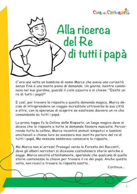Alla ricerca del Re di tutti i papà è una storia per bambini da dedicare al papà il 19 marzo, giorno in cui si festeggia la Festa del papà. Una storia adatta ai bambini della scuola primaria e a quelli più piccoli che frequentano la scuola dell’infanzia, che proponiamo da leggere online e da stampare gratuitamente, in una versione illustrata con un disegno da colorare. Per stampare la storia, scorri la pagina verso il basso e segui le istruzioni.