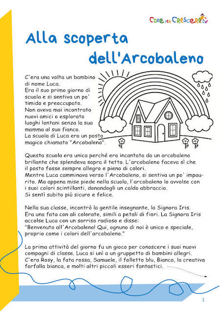 Alla scoperta dell’arcobaleno è una storia da raccontare ai bambini il primo giorno di scuola per aiutarli ad affrontare questa nuova esperienza. Un racconto per l’accoglienza dei bambini alla scuola dell’infanzia o in prima elementare. Una storia per bambini da leggere online o da stampare gratuitamente nella versione illustrata con un disegno da colorare. Per stampare la storia, scorri la pagina verso il basso e clicca sul testo dove segnato: si aprirà una seconda finestra con il racconto per l’accoglienza dei bambini in formato pdf, pronto per essere scaricato e/o direttamente stampato.
