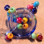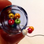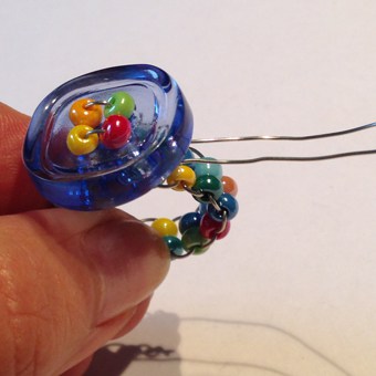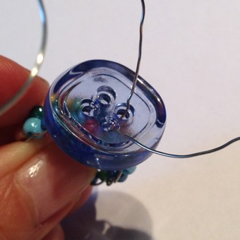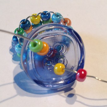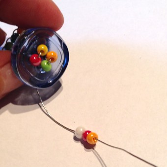 - Infilare 3 perline su ogni filo e ripassarlo in un buco del bottone, dall’alto verso il basso. Attorcigliare la parte di filo con le 3 perline, in modo da bloccarlo sul bordo del bottone.
