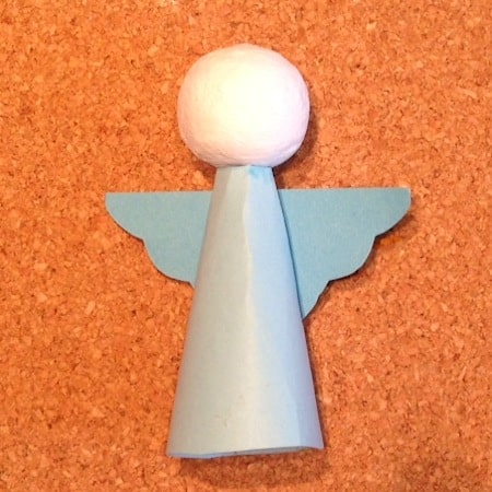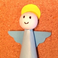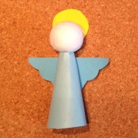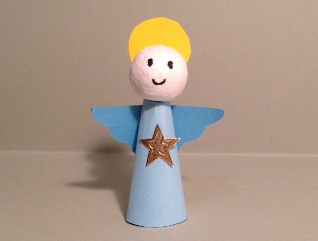- Incollare uno sticker natalizio o una stella disegnata e ritagliata sul vestito dell’angelo. L’angelo è finito!