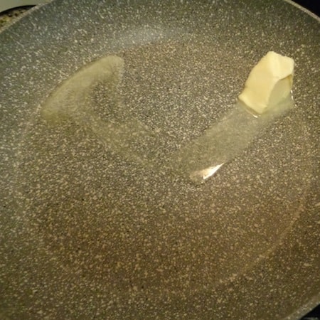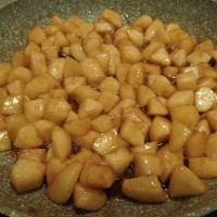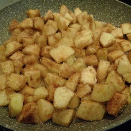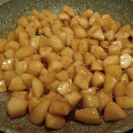 - Fare sciogliere lentamente 50 g di burro in una padella ampia. Aggiungere i pezzi di mela e lasciarli cuocere, mescolando ogni tanto, fino a quando saranno morbidi e dorati.