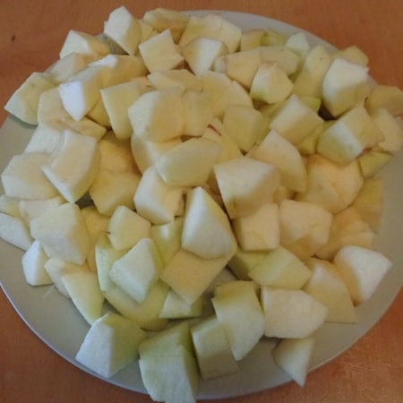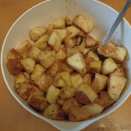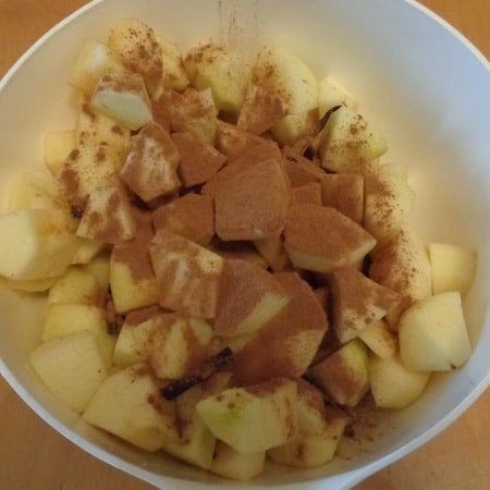 - Mischiare i pezzi di mela con lo zucchero di canna, la cannella e la vaniglia (aprire il baccello usando la punta di un coltello).