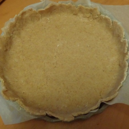 - Ungere uno stampo con un pezzetto di burro o foderarlo con carta da forno. Dividere l’impasto a metà. Con un mattarello, stendere la prima metà su una superficie infarinata cercando di ottenere un disco un po’ più grande dello stampo. Metterlo nello stampo e fare una serie di piccoli buchi usando una forchetta.