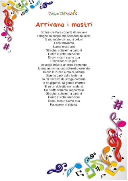 Una canzone per bambini da cantare la notte di Halloween: Arrivano i mostri! Una canzone per festeggiare Halloween, per ridere e scacciare le proprie paure di cui proponiamo il video tratto da Youtube, il testo da leggere online, da scaricare e stampare gratuitamente (scorrendo la pagina verso il basso). Per impararlo e cantarlo insieme!