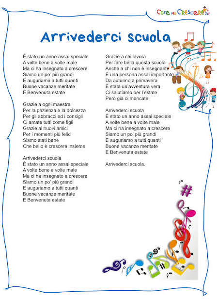 Una canzone da cantare tutti insieme l’ultimo giorno di scuola per salutare la scuola, ringraziare le maestre e tutte le persone che lavorano tutti i giorni dell’anno nella nostra scuola e augurare a tutti Buone vacanze! Arrivederci scuola è una canzone scritta da Davide Palumbo (testo e musica) di cui proponiamo il video tratto da Youtube per ascoltarla, il testo da leggere online per cantarla e in una versione da stampare gratuitamente per impararla. Per stampare il testo della canzone, scorri la pagina verso il basso e segui le istruzioni. Una canzone per la fine della scuola, perfetta per la Festa di fine anno scolastico adatta ai bambini della scuola primaria e della scuola dell’infanzia.