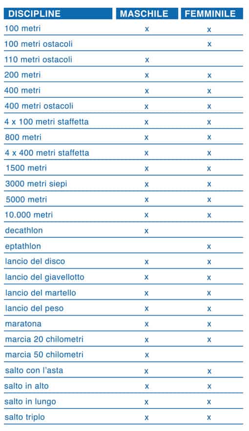 Le gare di atletica leggera si raggruppano in 3 grandi gruppi sia per gli uomini sia per le donne: