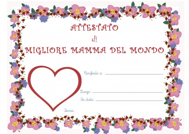 Attestato di migliore mamma Un diploma di migliore mamma del mondo, un attestato da conferire alla mamma per la Festa della mamma, per il suo compleanno o semplicemente per dirle quanto le vogliamo bene. Un attestato per la mamma da stampare gratuitamente. ATTESTATO DA STAMPARE Clicca sull’attestato per stamparlo: