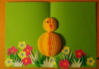 - Finire il lavoro, disegnando o colorando fiori ed erba, ritagliandoli e incollandoli all’interno del biglietto, intorno al pulcino.
