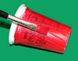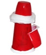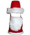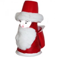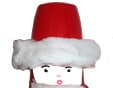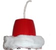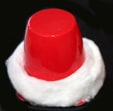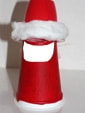 - Ritagliare una lunga striscia di cotone di circa 1 cm di spessore ed incollarla intorno alla base del vasetto capovolto (il corpo) in modo da fare un bordo di pelliccia bianca intorno al vestito rosso di Babbo Natale.