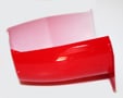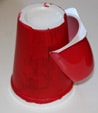 - Tagliare uno dei due vasetti di formaggio alla frutta nel senso della lunghezza ed incollarlo sul vasetto dello yogurt capovolto. Questo mezzo vasetto di formaggio alla frutta sarà il cestino che Babbo Natale porta sulle spalle.