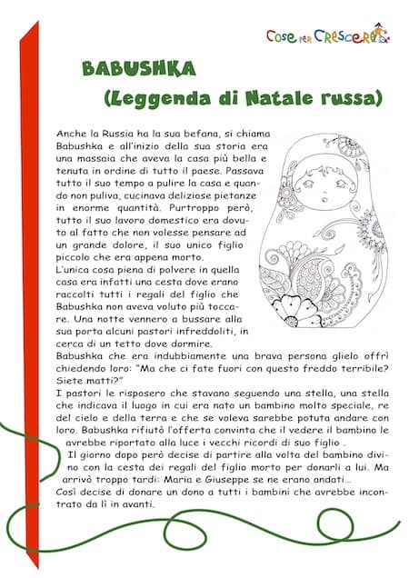 Anche la Russia ha la sua befana, si chiama Babushka e all’inizio della sua storia era una massaia che aveva la casa più bella e tenuta in ordine di tutto il paese. Passava tutto il suo tempo a pulire la casa e quando non puliva, cucinava deliziose pietanze in enorme quantità. Purtroppo però, tutto il suo lavoro domestico era dovuto al fatto che non volesse pensare ad un grande dolore, il suo unico figlio piccolo che era appena morto.