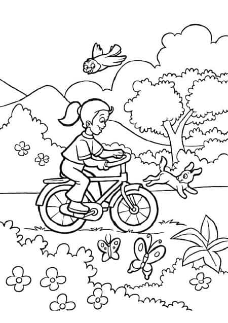 Un bel disegno da colorare da proporre ai bambini per festeggiare la fine dell’inverno: una bambina felice di fare una gita in bicicletta con il suo cane gioioso, in mezzo alla natura che si risveglia e accompagnata da magnifiche farfalle. Un disegno da stampare gratuitamente e adatto ai bambini che frequentano la scuola primaria.