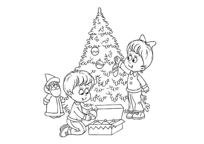 Disegno di bambini che addobbano l’albero di Natale da stampare