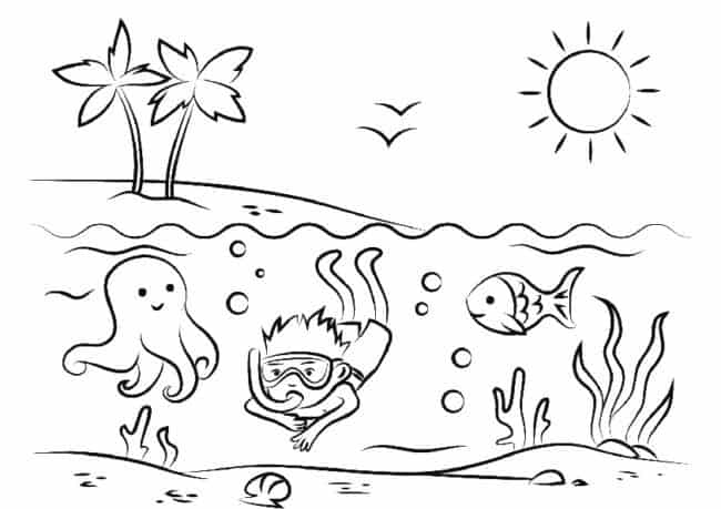 Un bambino subacqueo da colorare, un disegno per l’estate da stampare gratuitamente. Un disegno da proporre ai bambini durante le vacanze estive o per aiutarli a pazientare, contando i giorni che mancano alla partenza per il mare. I disegni da colorare sono inoltre un passatempo per i bambini per i lunghi viaggi in macchina… averne sempre un po’, pronti, stampati e a portata di mano, può rivelarsi molto utile!