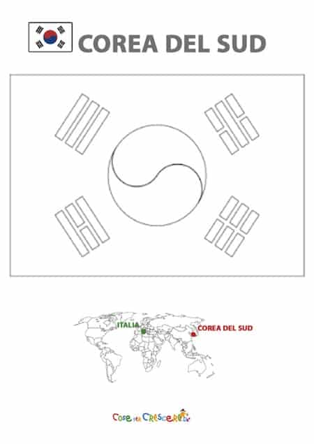 Il disegno della bandiera della Corea del Sud da stampare e colorare gratuitamente. La Corea del Sud o, più esattamente la Repubblica di Corea, è uno Stato dell’Asia orientale che occupa la parte meridionale della penisola coreana. La sua capitale è Seul (una delle città più popolate del mondo) e la lingua ufficiale è il coreano di cui la forma scritta si chiama l’hangul. La moneta è il won. Il simbolo della Corea del sud è una tigre.