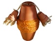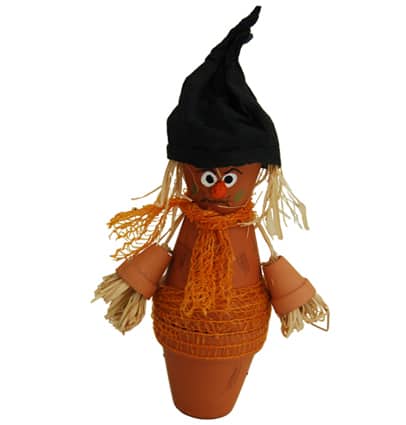 - Sistemare la lunghezza delle braccia e annodare i fili di rafia in modo da fissarli. Incollare il secondo vaso del corpo sotto al primo (quello munito di braccia). Incollare della rete per le patate intorno ai due vasi, come una cintura.