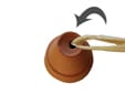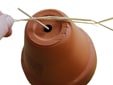 - Prendere 2 o 3 fili di rafia per le braccia. Annodare lo stuzzicadenti al centro dei fili di rafia (non deve essere più lungo del diametro del fondo del vaso del corpo: se bisogno, spezzare le punte). Inserite lo stuzzicadenti nel buco di uno dei vasi più grandi e tirare la rafia.