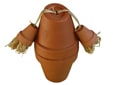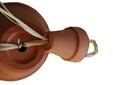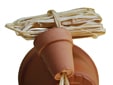 - Prendere una delle estremità dei fili di rafia, piegarlo in due ed infilarlo nel buco di uno dei vasi più piccoli lasciando sporgere oltre al vaso un anello di rafia (come nell’immagine). Fare un piccolo fagotto di rafia ed infilarlo nell’anello. Tirare e sistemare. Fare il secondo braccio allo stesso modo.