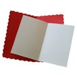 - Dividere in due il foglio di cartoncino rosso (si ottiene un formato 15 x 21 cm) e piegarlo in due. Disegnare un rettangolo di 18 x 12 cm sul foglio bianco e ritagliarlo. Se possibile, utilizzare forbici fantasia o, nel caso contrario, tagliare in modo irregolare. Piegare in due anche il rettangolo bianco.