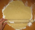 • Sul piano di lavoro infarinato, stendere la palla d’impasto, dandole uno spessore di circa 4/5 mm.