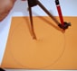 - Con il compasso, tracciare due cerchi da 8 a 12 cm. di diametro (a secondo della grandezza dell’imballaggio), su un foglio di cartoncino arancione. Ritagliare i due cerchi.