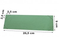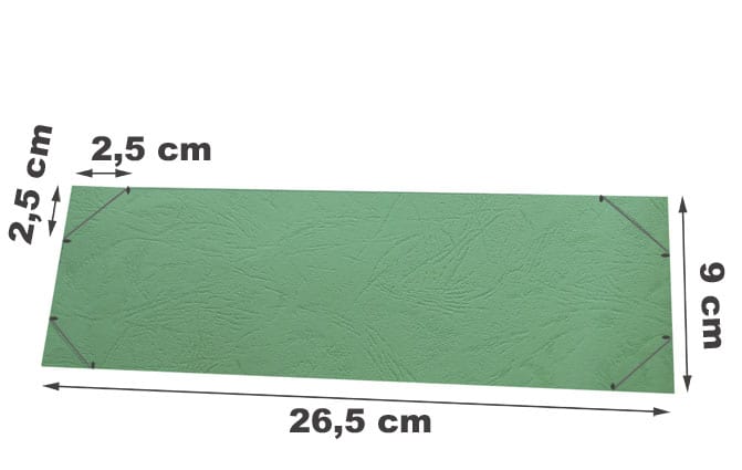 • Preparare la copertina della sua borsetta dei ricordi: tracciare e ritagliare la parte interna. In un foglio di cartoncino colorato tracciare un rettangolo di 26,5 cm x 9 cm. Ritagliarlo. In ognuno dei 4 angoli, tracciare la base di un triangolo di 2,5 cm e ritagliarlo (cliccare sull’immagine per ingrandirla).
