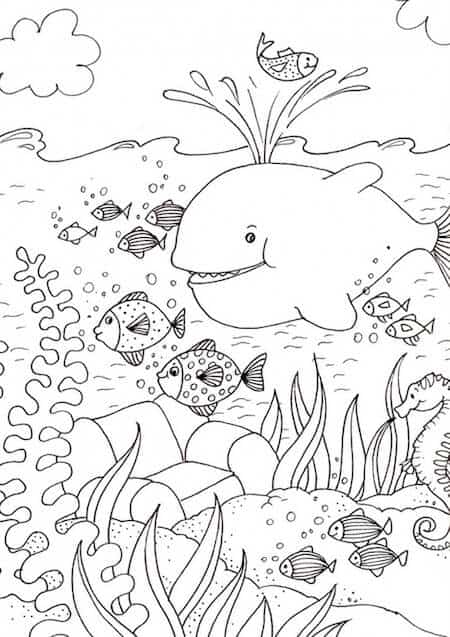 Un disegno sul mare per bambini e divertente, da colorare durante le vacanze al mare: il disegno di balena e pesci da colorare con un bel fondale marino. Un disegno adatto ai bambini più piccoli perché, anche se contiene diversi particolari, è composto da forme piuttosto grandi e lineari e dunque facilmente colorabili. Un disegno per bambini che è anche l’occasione di osservare con loro gli elementi che lo compongono e che fanno parte del paesaggio marino!