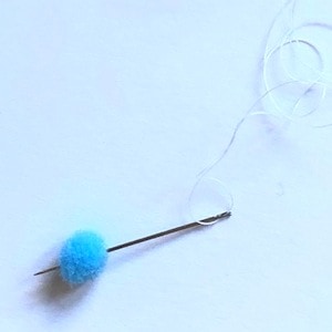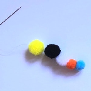 - Infila il filo nell’ago e fai un nodo alla fine del filo. Inserisci l’ago in uno dei pon pon più piccoli e fallo scorrere fino alla fine del filo (fino al nodo).