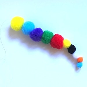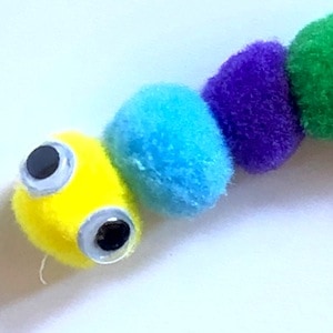 - Incolla gli occhi sulla testa del bruco (l’ultimo pon pon più grosso).