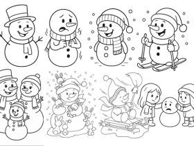 La scritta Buon Anno è decorata con simpatici personaggi invernali, pronta per essere colorata con i colori preferiti dei bambini. È un’attività ideale per: