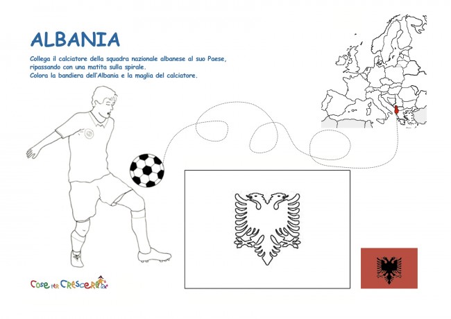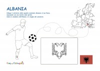 Il disegno di un calciatore della Nazionale albanese da stampare e colorare per divertirsi durante gli Europei di calcio ed imparare a conoscere maglie e bandiere dei paesi partecipanti. I bambini dovranno colorare la maglia della squadra albanese, la bandiera dell’Albania e collegare il calciatore al suo paese d’origine.