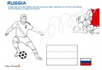 Disegno di un giocatore della nazionale di calcio russa da stampare e colorare. I bambini potranno anche colorare la bandiera della Russia e collegare il calciatore al proprio Paese. un modo divertente di conoscere la bandiera russa e capire dov’è la Russia rispetto all’Italia.