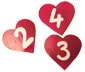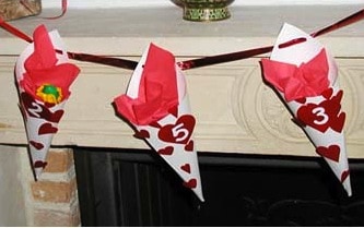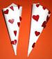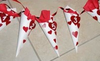 - Mettere un tovagliolo (con sorpresina) in ogni cono. Incollare il cuore con il numero corrispondente su ogni cono.