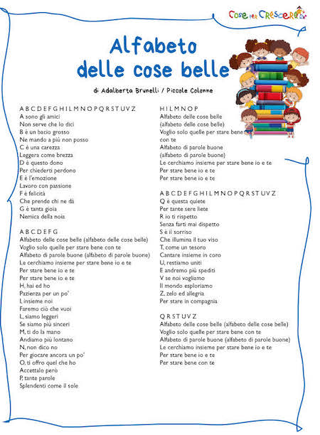 Una vera e propria gemma: la canzone Alfabeto delle cose belle da Piccole Colonne, una canzone perfetta per accogliere i bambini a scuola, in particolare il primo giorno. Scorrendo la pagina verso il basso, potrai vedere e ascoltare il video della canzone, leggere il testo online per cantarla e scaricare il testo in formato pdf gratuitamente!