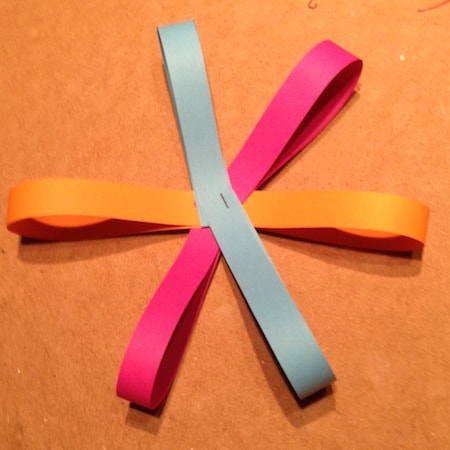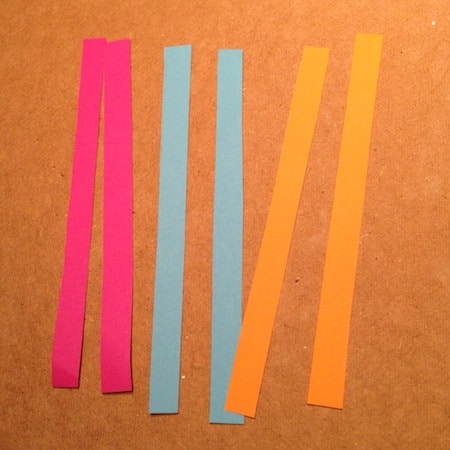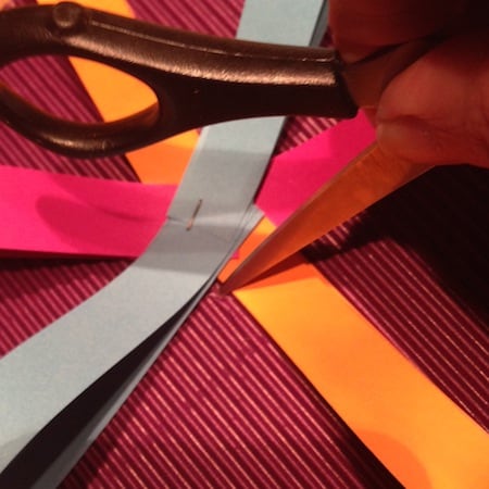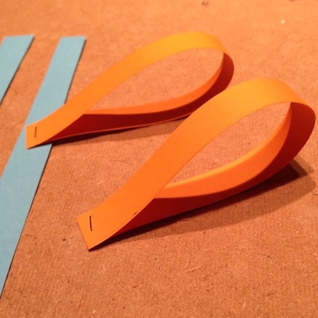 - Ritagliare 8 strisce di carta colorata (2 per colore) di 20 cm x 1,5 cm. Piegare ogni striscia in modo da formare una specie di anello e incollare le estremità tra di loro (o pinzarle).