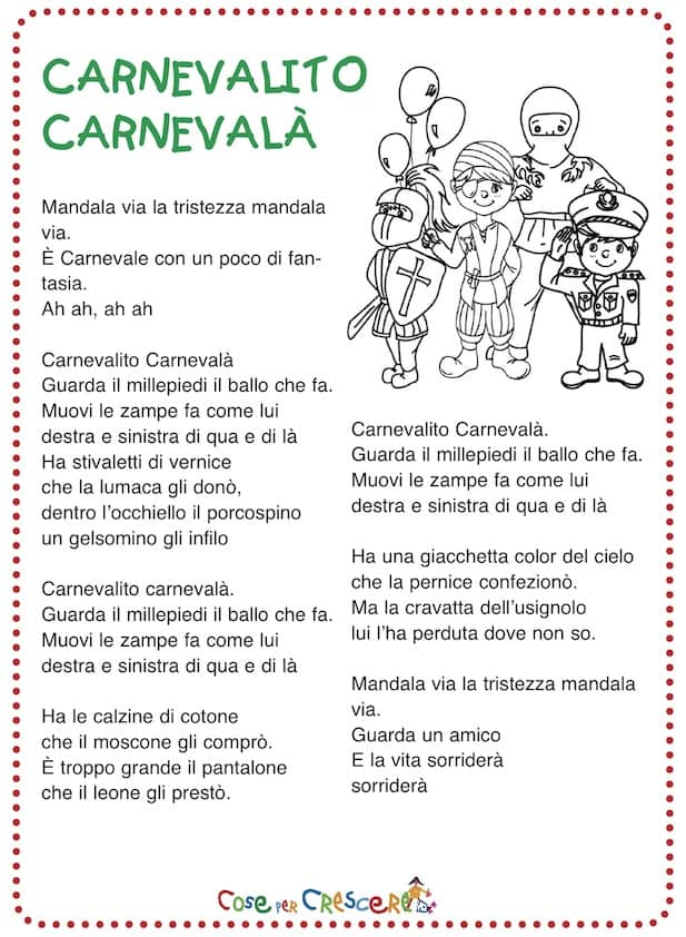 Una canzone di Carnevale che partecipò alla 25° edizione dello Zecchino d’Oro, nel 1982, una canzone per bambini di Lavanchy Bolsien , A. Testa e C. Lavanchy Bolsien. In fondo all’articolo, il testo della canzone da stampare con un bel disegno da colorare.