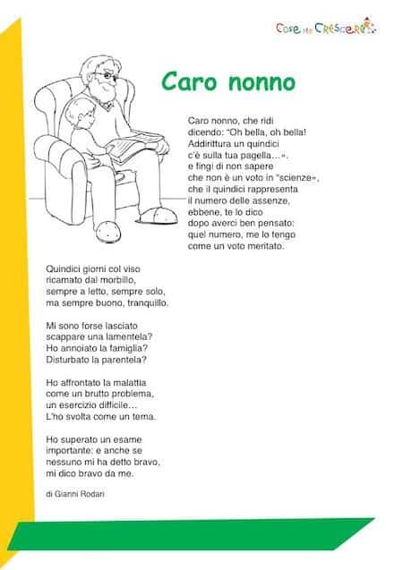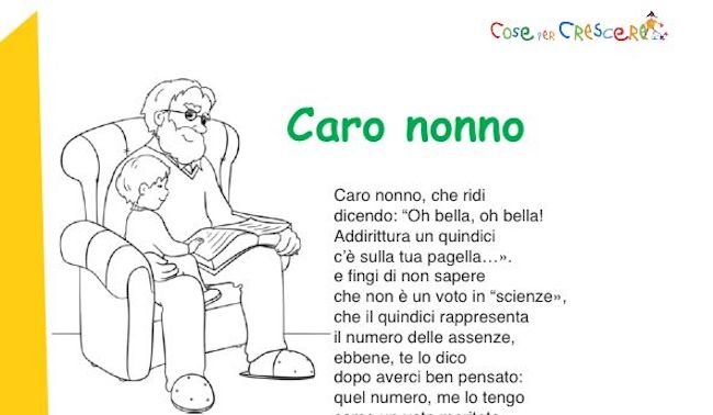 Una bella poesia da dedicare al nonno il 2 ottobre, in occasione della Festa dei nonni, per il suo compleanno o molto semplicemente per dirgli quanto gli vogliamo bene. Caro nonno è una poesia per bambini scritta da Gianni Rodari, che proponiamo sia da leggere online che in una versione illustrata con un disegno da colorare e da stampare gratuitamente.