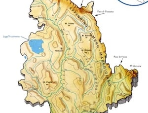 L’Umbria è caratterizzata da una notevole varietà paesaggistica, grazie al continuo susseguirsi di aree collinari e fondovalle fluviali. Questo articolato sistema orografico, che si identifica con le zone della Valle Umbra e della Valtiberina, nel settore orientale e meridionale della regione si innalza progressivamente con le dorsali montuose della Valnerina fino a superare i 2.400 metri nel gruppo del Monte Vettore, nel massiccio dei Sibillini, condiviso con le Marche. Il variegato territorio regionale è costellato da città ed insediamenti ricchi di storia e tradizioni.