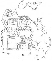 Una spaventosa casa delle streghe da colorare. Questa casa è piuttosto inquietante e per niente invitante, circondata da un enorme pipistrello, un gatto dall’aspetto poco simpatico e una strega che ha appena spiccato il volo sulla sua scopa… brrrrrrr!!!